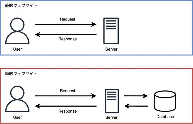 静的ウェブサイトは、サーバー側での動的処理が必要なく、HTML や CSS、画像などの静的ファイルだけが配信されるサイトになります。 動的ウェブサイトは、データベースなどを使ってデータをベースに動的処理を行い、ユーザーごとに異なるコンテンツを返すサイトになります。